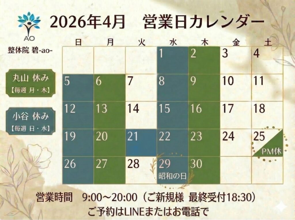 日頃より整体院碧-ao-をご愛顧いただき、誠にありがとうございます。 桜の便りが届き始め、新しい生活が始まる季節となりました。 皆様の心身の健康を支えられるよう、今月も誠心誠意努めてまいります。